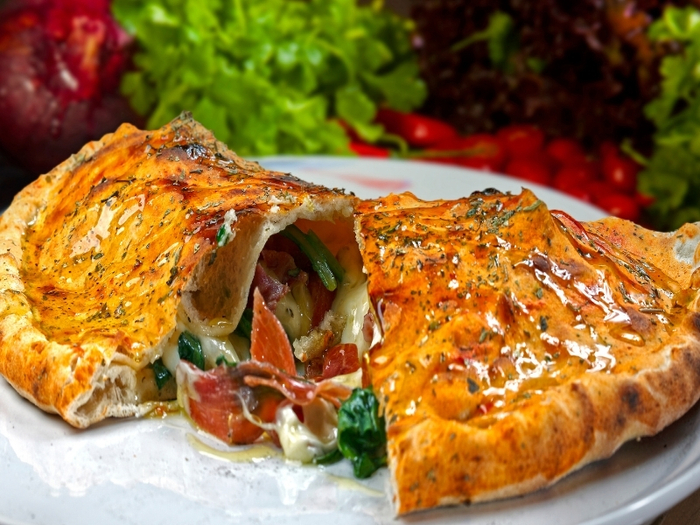 Calzone filled with tomato sauce, mozzarella, beef ham and mushrooms.