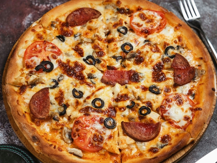 Domates sos, mozzarella, jambon, sucuk, mantar ve siyah zeytin ile.