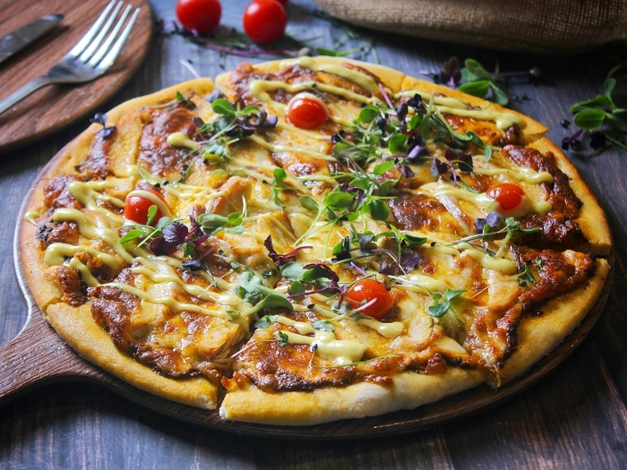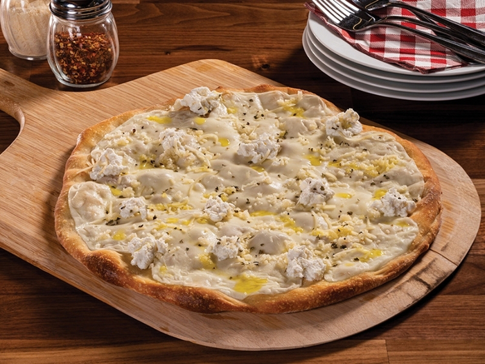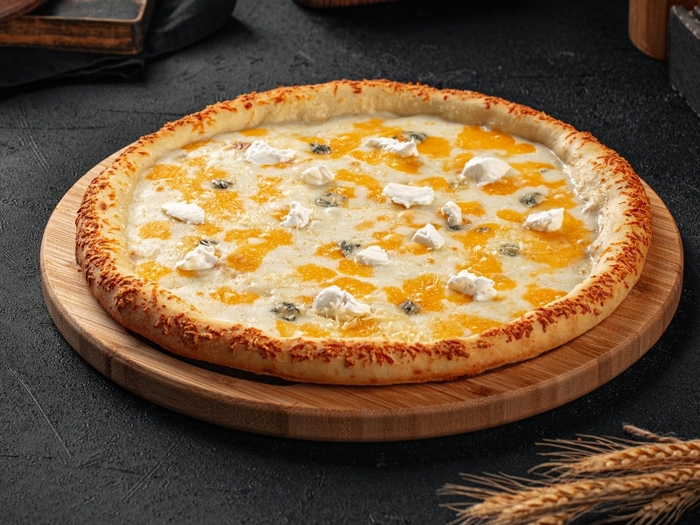 Four-cheese pizza with mozzarella, cheddar, blue cheese and parmesan.