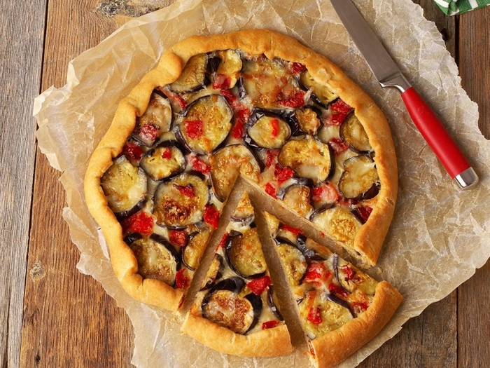 Pizza with mozzarella, roasted red peppers and roasted eggplant.