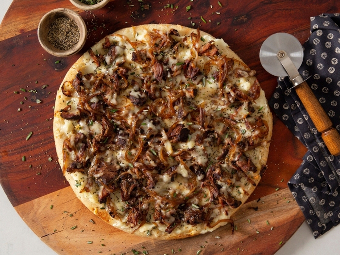 Pizza with mozzarella, bolognese sauce, mushrooms, cheddar and onions.