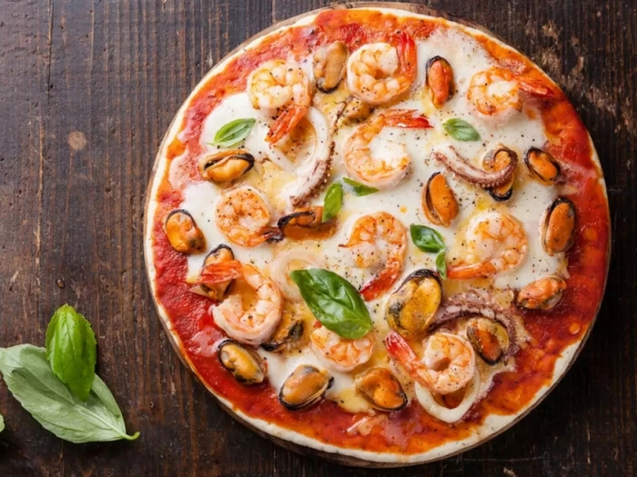 Domates sos, mozzarella, karışık deniz ürünleri, mantar ve soğan ile.
