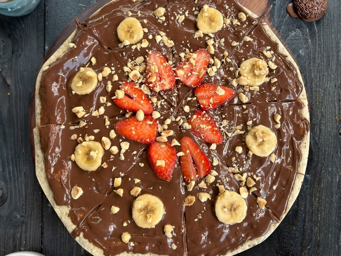 Nutella ve muz ile hazırlanan tatlı pizza.Sweet pizza topped with Nutella and banana.